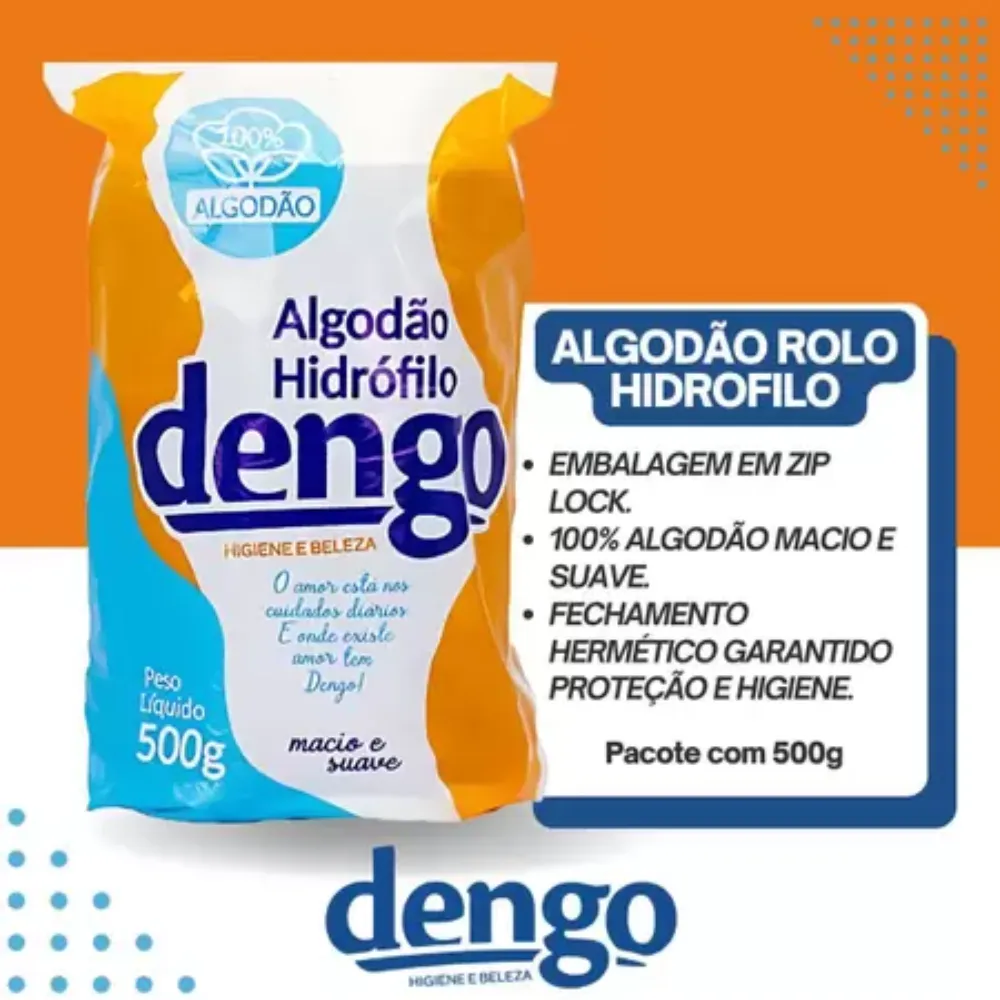 Produzido a partir de rigorosa seleção de fibras naturais 100% algodão, o rolo de algodão Dengo é alta qualidade, maciez, pureza e alto poder de absorção.